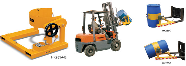 ● HK285A,HK285B駕駛員無需離開叉車,通過鏈條即可實現油桶的翻轉,HK285C通過手搖實現油桶翻轉